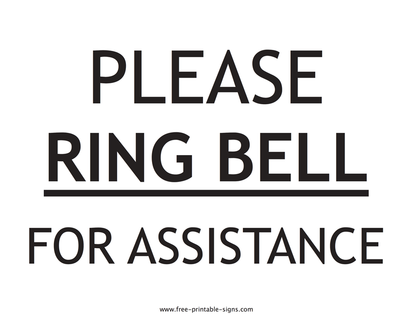 Download this printable “Please Ring Bell For Assistance” sign to inform customers or visitors that help is readily available if they ring the bell. Hang this sign near the service desk, counter or other areas where immediate assistance may be needed for an improved customer experience. Format: PDF. Paper size: US Letter. Dimensions: 11 x 8.5 inches. Orientation: landscape, horizontal.